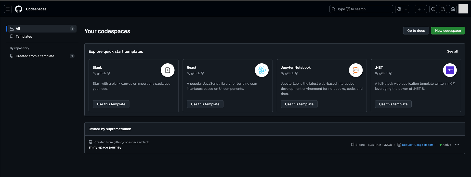 GitHub Codespaces를 시작하기 위해 필요한 것은 GitHub 계정과 코드를 저장할 Repository(저장소)뿐입니다. 기존에 작업하던 프로젝트가 있다면 해당 저장소에서, 없다면 새로운 저장소를 하나 생성하고 시작할 수 있습니다.
